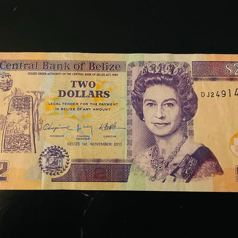 Två kanadensiska sedlar, en på 1 dollar och en på 2 dollar. Båda sedlarna har porträtt av drottning Elizabeth II. 1-dollarsedeln är från Bank of Canada och har serienummer EC5369978. 2-dollarsedeln har en röd och beige färgton och visar också drottning Elizabeth II.