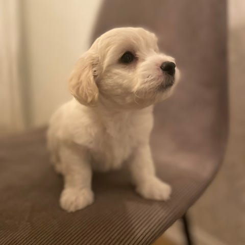 Mamman är alltså en blandning mellan Maltes och dvärgpudel och väger ca 5kg, hon är 4år och världens snällaste vovve med ett helt otroligt psyke, hon är väldigt försiktig och inkännande och har för vår familj agerat en stor stöttepelare gällande psykisk ohälsa. Hon älskar allt och alla, och leker försiktigt både med små barn såväl som vuxna. Vi har även katter i hemmet som valpen fått socialiserat sig med.
