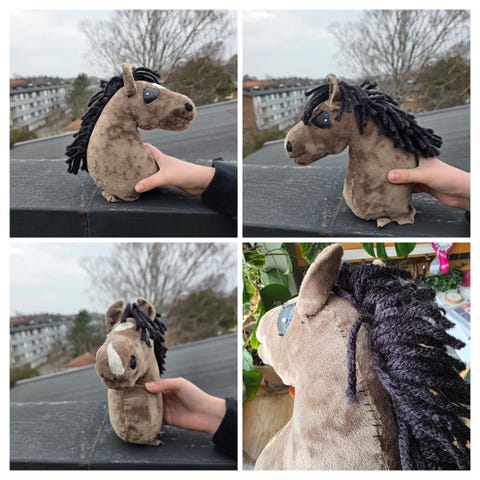 Två käpphästar av märket Hobby Horse från Panduro. Odekorerade för att man själv ska kunna sy på ögon, man osv.