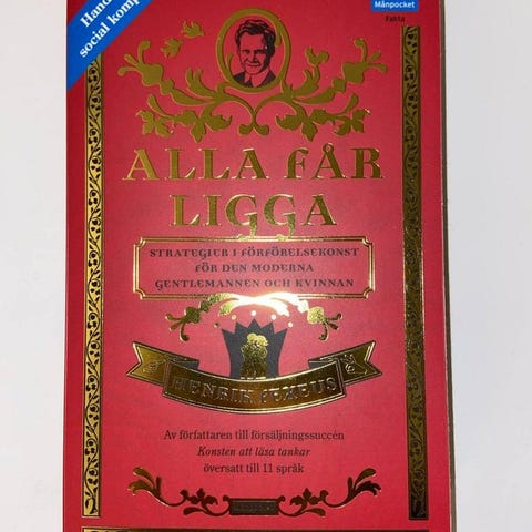 Jag säljer boken ”ALLA FÅR LIGGA; strategier i förförelsekonst för den moderna gentlemannen och kvinnan” från 2008 av Henrik Fuxeus. Inbunden. Helt ny! Med skyddande pappomslag.
