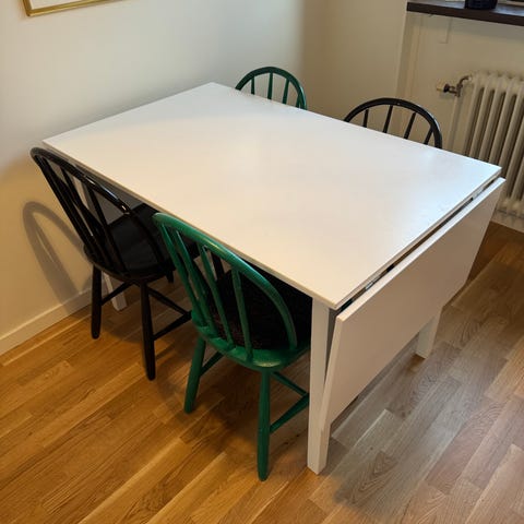 Mycket fint matbord i massivt trä. Längd 62+28+28 cm. Naturfärg på skivan vitlackade ben. Två utfällbara klaffar.