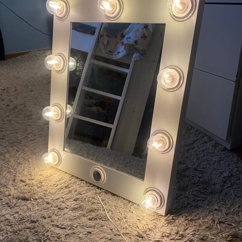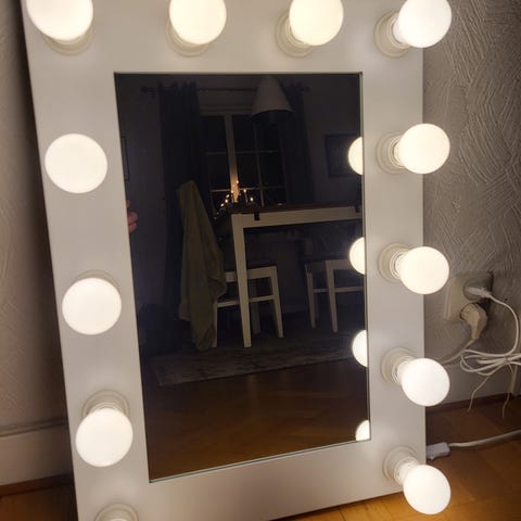 Sminkspegel, badrumsspegel. Mycket bra skick. Slät spegelyta då lamporna är placerade bakom spegelglaset. Lika med lättstädad. Extralampa följer med.