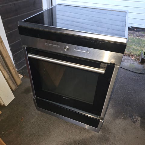 Glaskeramikspis med fyra vred för inställning av värme och ugnslucka i glas. Spisen har en glaskeramikhäll med fyra kokzoner och en inbyggd ugn med glasfront.