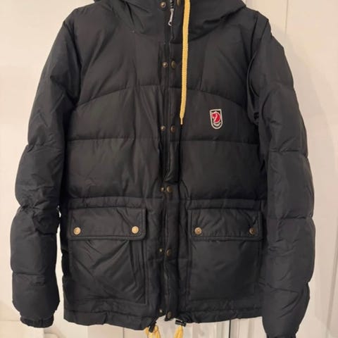 Blå Fjällräven dunjacka/vinterjacka i storlek S jackan är stor i storleken, skulle säga att den passar bra från storlek M upp till storlek L-XL.
