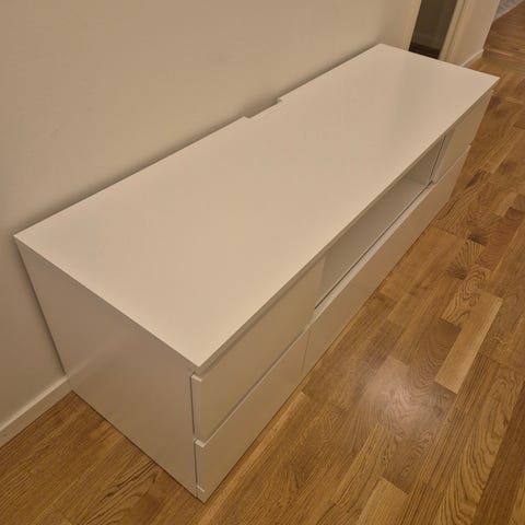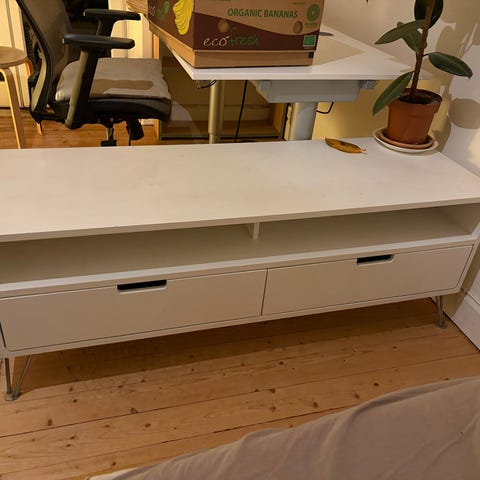 IKEA TV-bänk i vit färg. Möbeln har en låg profil med två lådor och en öppen hylla för förvaring. Passar för placering under TV och kan användas för att organisera mediautrustning och tillbehör.
