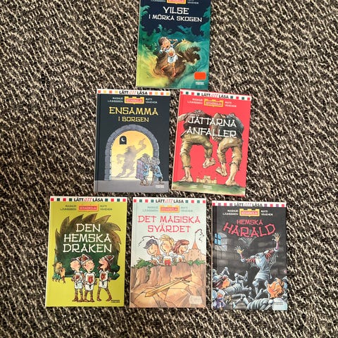 En samling barnböcker av Mårten Sandén, inklusive titlar som "Gömstället", "Arvtagare", "Juveltjuven", "Gängaren", "Spökskeppet" och "Skatan". Böckerna har färgglada omslag och riktar sig till yngre läsare.