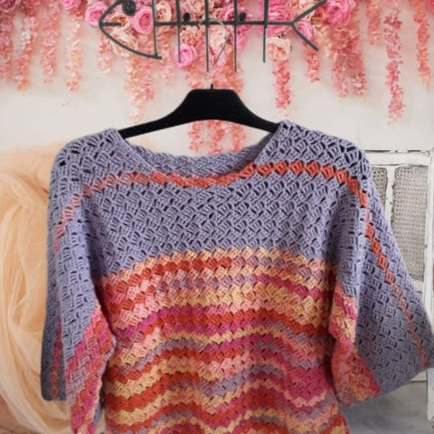 Hemstickad festtopp efter köpt mönster. Blandgarn men huvudsakligen bomull tror jag, troligen lite viskos och syntet också. Likadan fram- och baksida. Kan hämtas i Stockholms innerstad eller skickas.