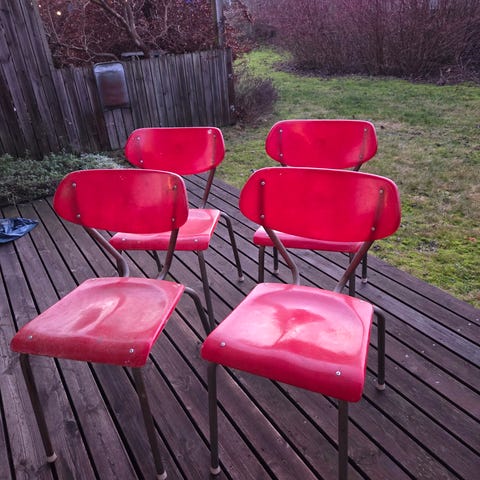 Par stilrena armstolar från 1960/70-tal i formpressad plywood (Pagholz/Pagwood-typ) med stabilt rörstativ i stål. Tidlös industridesign.