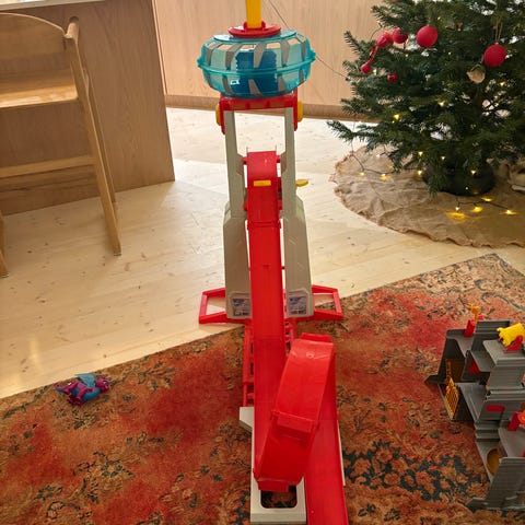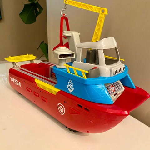 Paw Patrol lekset som inkluderar en röd och vit båt, ett räddningstorn med rutschkana samt flera små fordon och figurer.