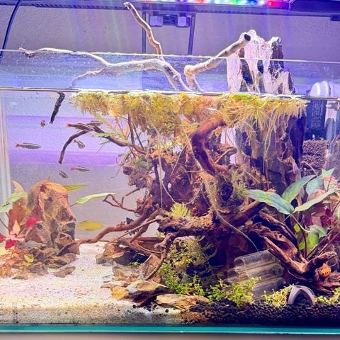 Akvarium 60 L med luftfilter och belysning. Akvariet innehåller sandbotten, växter och dekorationer. Passar för små till medelstora sötvattensfiskar.