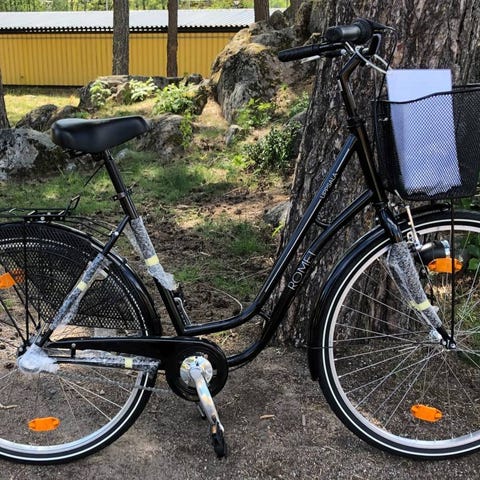 Röd damcykel utrustad med framkorg och pakethållare bak. Cykeln har en låg instegsramp för enkel på- och avstigning. Passar för vardaglig användning och transport. Finns mitt i uppsala. Av märket kronan med dokument hållare.