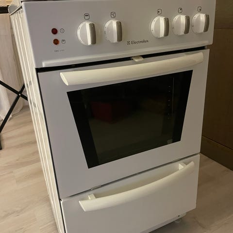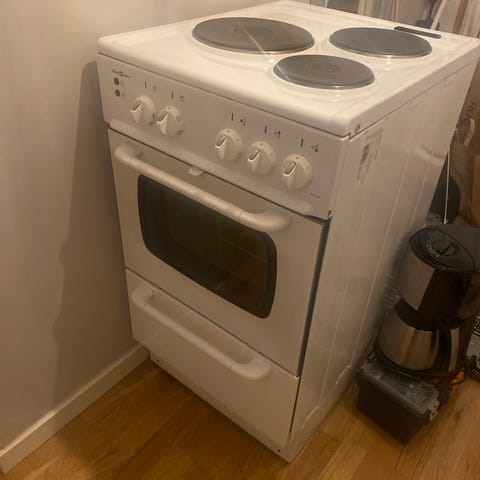 Elektro Helios bänkspis med fyra kokplattor och ugn. Vit färg och traditionell design för köksbruk.