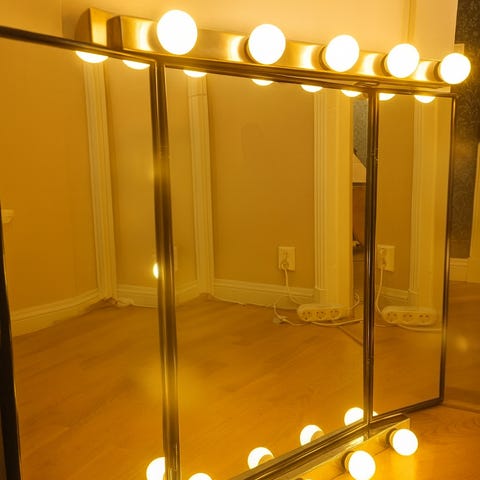 Sminkspegel med dimbar, varmvit LED-belysning.