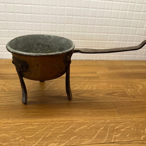 Koppar gryta med handtag och tillhörande glaskoppar. Grytan är tillverkad i kopparmaterial och har en rund form med lock. Glasen är små och avsedda för servering av dryck. Produkten kan användas för matlagning och servering.