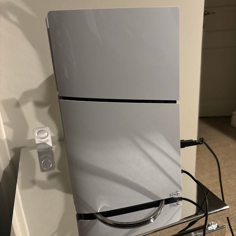 Sony Playstation 5 spelkonsol i vitt utförande. Konsolen har en modern design med svart och vitt färgschema. Den är avsedd för användning med Playstation 5-spel och tillbehör.