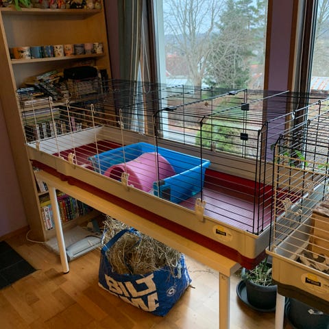 Bur för smådjur med svart botten och vitt galler. Inkluderar spån, matskålar, leksaker och andra tillbehör för smådjur. Vi har haft den till våra marsvin.