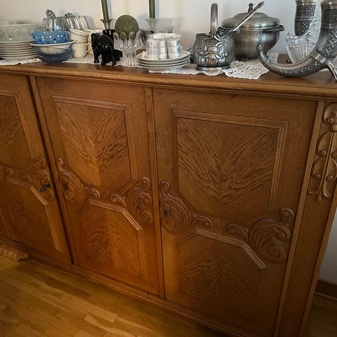 Antikt ekskåp i trä med snidade detaljer. Stora förvaringsutrymmen med lådor och hyllor. Detaljerade sniderier pryder både dörrar och kanter och krönet.