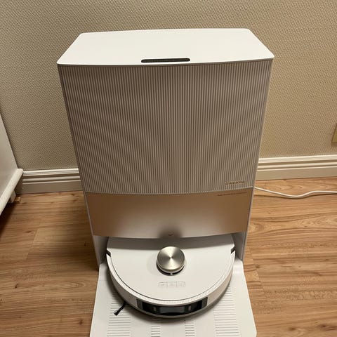 Dreame robotdammsugare med självtömmande station i vit färg. Enheten är designad för automatiserad golvrengöring och inkluderar en laddnings- och tömningsstation för bekväm användning.