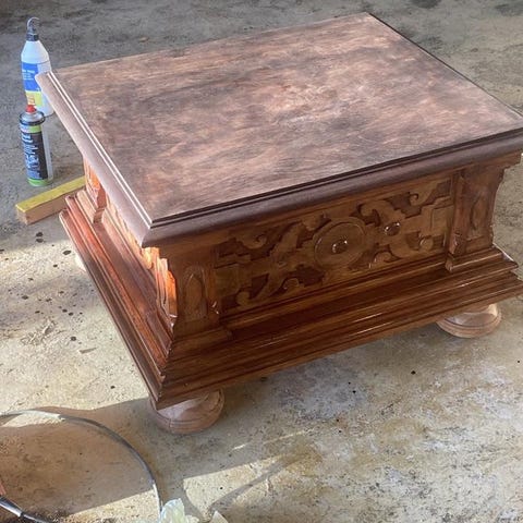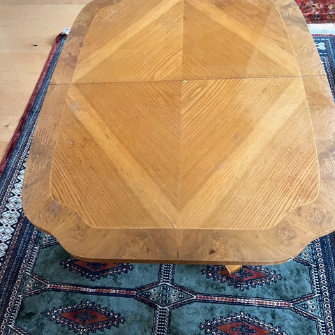 Bordet är i ädelträ med en mörkbrun finish-Tillverkat i England och har en kompakt design som passar som sidobord. med utdragbara skivor på båda sidor. Se bild.