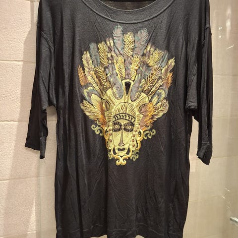 I skick som ny, behöver steamas då den kommer direkt från garderoben. Använd en gång. Mycket vacker grön färg med mönster i brons och svart. Helt utan defekter.