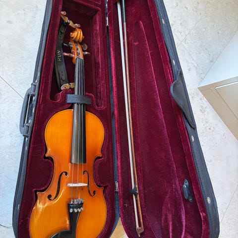 Cello i ovanlig svart färg med fodral och stråke, sordin, notställ samt ”end pin anchor” ingår. Allt som behövs för att börja spela!