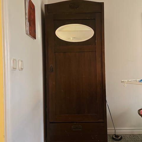 1 stort och väl patinerat metallskåp från Isidor i Stockholm från ca mitten av 1900-talet. Märken, skrap och repor finns, se bilder för egen uppfattning om skick. Nyckel saknas. Ca 192*101 cm, djup ca 51 cm. Finns i Sätila, Marks Kommun men även levereras till Göteborg/Stockholm/Malmö med omnejd mot ersättning.