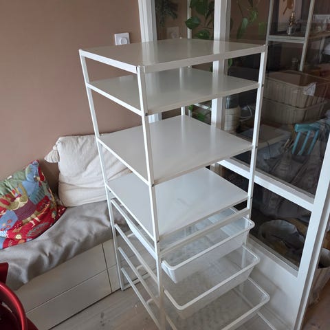 IKEA JONAXEL förvaringshylla med fyra trådkorgar. Hyllan är tillverkad av metall, funkar bra i både tvättstuga och badrum.