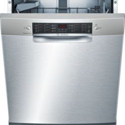 Den 60 cm breda Siemens iQ500 SN45Z-diskmaskinen installeras under köksbänken på ett elegant sätt. Den lugnande blå emotionLight-innerbelysningen lyser upp stålinsidan som rymmer upp till 14 kuvert. Ett ångskydd för köksinredningen och en plint ingår i förpackningen.