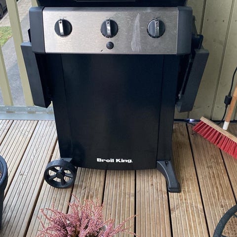 Broil King gasolgrill med fyra brännare, svart färg och sidobord i rostfritt stål. Grillskåp med dubbla dörrar för förvaring. Utrustad med termometer på locket för temperaturkontroll.