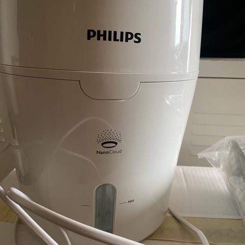 Ett oöppnat luftfuktarfilter från Philips ingår.