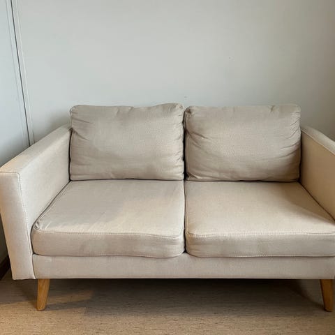 Soffan är i ett fint begagnat skick. Soffan har två mindre fläckar (se bild) och lite slitage på ett armstöd (se bild). Soffan har avtagbara sitt- och ryggdynor och finns i ett djur-och rökfritt hem.
