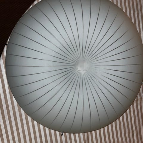 En stilren taklampa från IKEA, modell Calypso. Lampan har en diameter på cirka 58 cm och en höjd på 7.5 cm. Den är avsedd för 3 ljuskällor med max 60W.