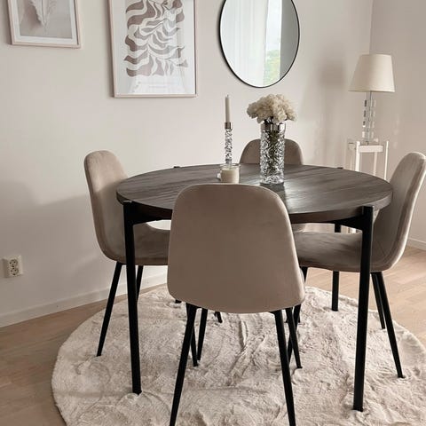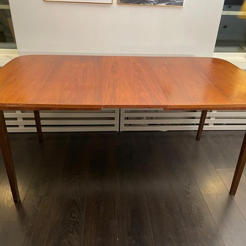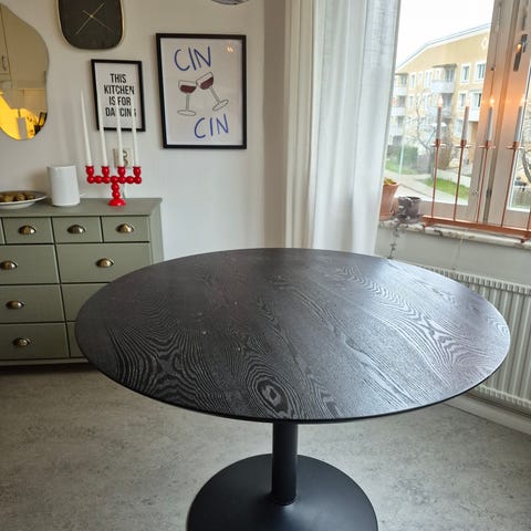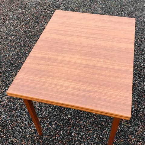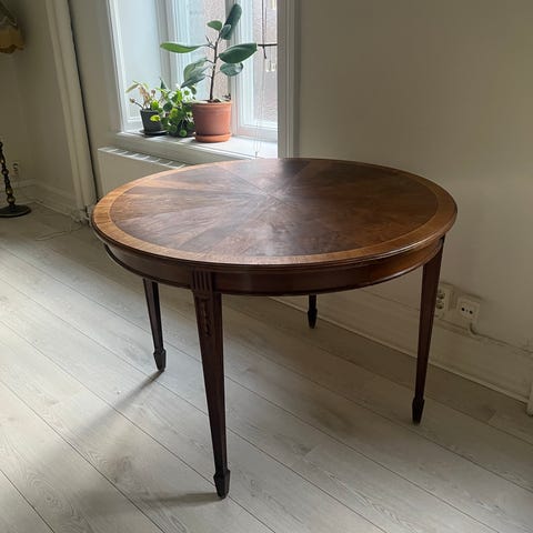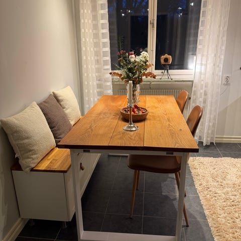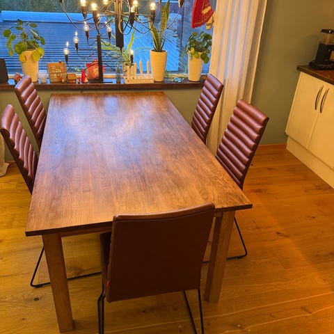 Matbord i massiv ek med tillhörande förlängningsskiva på 50 cm. Bordet går att slipa och olja in. Bordets mått (utan förlängningsskivan) är 180 x 100 cm, höjd 75 cm.