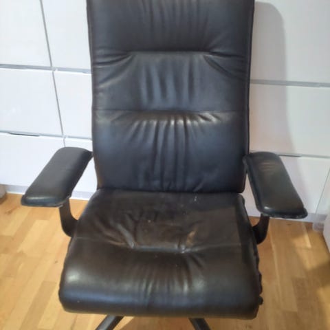 Kontorsstol i svart läder med justerbara armstöd och hjul för enkel förflyttning. Stolen har en ergonomisk design för stöd och komfort vid arbetsplatsen.