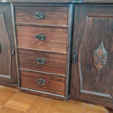 Antik skänk i ljus björk med dekorativt mönster på dörrarna. Möbeln har två lådor och tre skåp med hyllor inuti. Passar för förvaring av porslin, glas och andra hushållsartiklar.