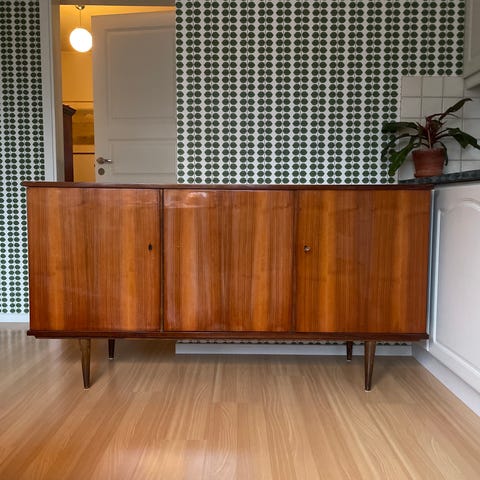 Retro sideboard/hylla i teak , 50/60-tal. 3 st hyllor nedtill. Fin helhet men finns en fläck upptill. Går att slipa bort och få fin!
