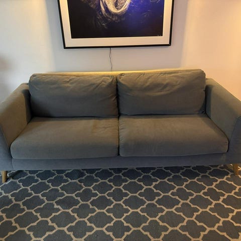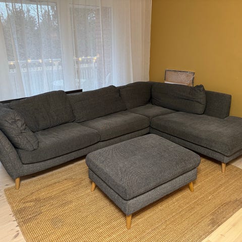 Soffa med divan till vänster och extra nackkudde. Tyg Orinocco färg beige. Bra skick utan fläckar eller slitage i tyget.