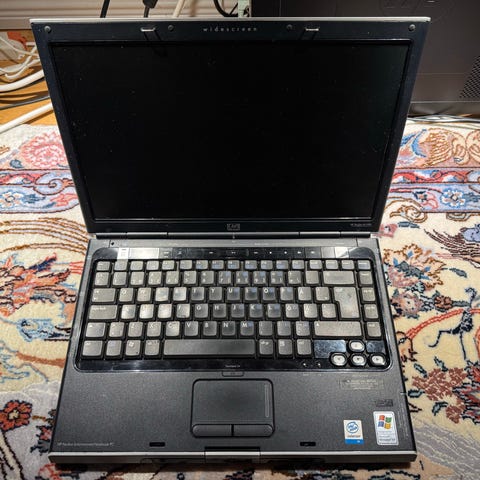 HP laptop med silverfärgad chassi och inbyggt tangentbord. Skärmen är svart och enheten har en pekplatta under tangentbordet.