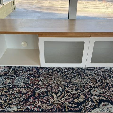 Två stora rymliga lådor på hjul med löstagbara cd-ställ. Tre lådor framtill med plats för tv-tillbehör/tv-spel. Baksidan har en öppning för kablar.