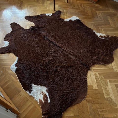 Skinnfäll i svart och vitt med naturlig form. Kan användas som golvmatta eller dekoration. Mjuk päls.