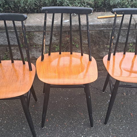 3st pinnstolar från 50talet mycket lätta och stabila , ena stolen har ljusare nyans som syns på bilder , går att betsa eller måla om alla på svart färg.