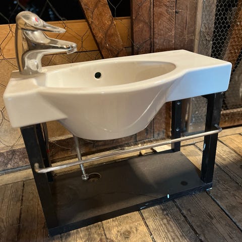Handfat med skåp och kran.