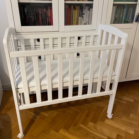 JLY Spjälsäng i vitt trä. Passar för små barn och är utformad för att ge en säker sovplats.