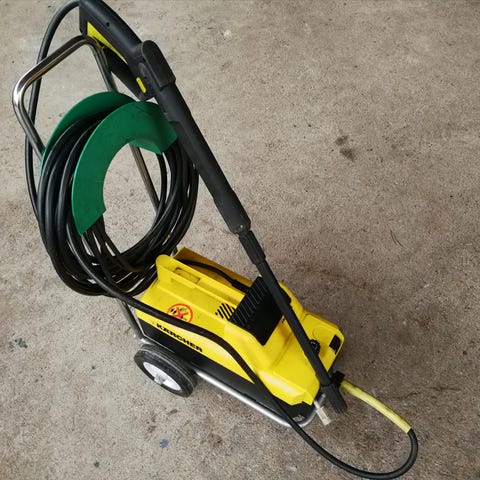 Kärcher K2 högtryckstvätt i gul färg. Utrustad för rengöring med högt tryck, lämplig för mindre rengöringsuppgifter.