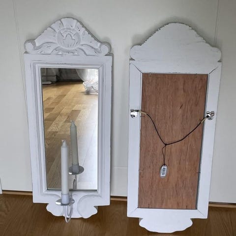 Spegel med kronform och hjärtdekorationer. Spegeln har en dekorativ design med tre cirklar på toppen och tre hjärtan under. Färgen är ljus med metalliska detaljer på hjärtan. Spegeln är avsedd för väggmontering och kan användas som inredningsdetalj till rummet.