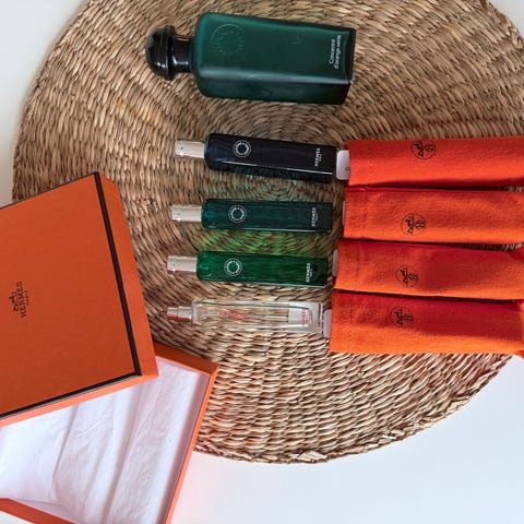 •Hermès Twilly d'Hermès Eau Ginger parfym med dekorativ scarf runt flaskhalsen.