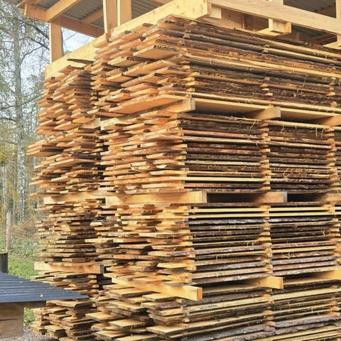 Uppsågat och lagda på tork under tidig vår 2025.