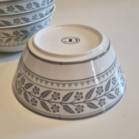 Tre mindre skålar (ca 16 cm) och en stor skål (ca 27 cm lång, 22 cm bred). De mindre skålarna har lite smårepor, den stora är i toppenskick.