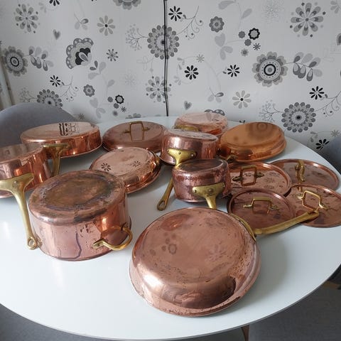En samling antika köksredskap inklusive en kaffekvarn en metallklocka, en måttbägare i metall, samt flera olika verktyg.