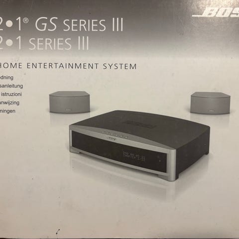 Bose 3-2-1 GS Series II högtalarsystem med flera komponenter inklusive subwoofer och satellithögtalare. Systemet är avsett för hemmabio och ljuduppspelning och levereras med kablar och fjärrkontroller.